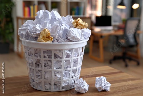 crumpled, paper, garbage bin, trash, office, desk, mistake, creativity, idea, brainstorming, bankruptcy, frustration, garbage, reject, recycling, ball, work, business, document, concept, planning, strategy, writing, deadline, problem, solution, attempt, inspiration, unsuccessful, close, up, nobody, indoor, white, gold, wooden, rejection, difficulty, project, management, studying, study, education, learning, student, entrepreneur, disorganized, mess, environmental
