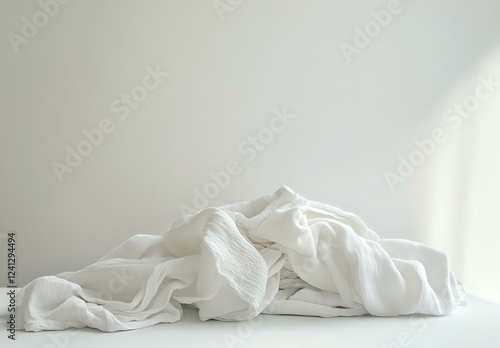 Crumpled white fabric with soft folds and gentle shadows against light background creates minimalist composition with delicate texture and ethereal mood.