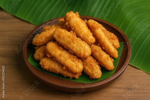 Crunchy fried banana served on a rustic wooden plate with a banana leaf