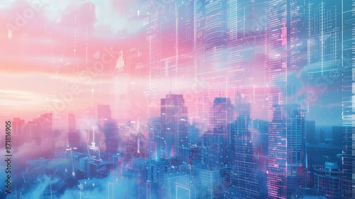 crypto robotics AI matrix data visualization with futuristic skyscrapers double exposure in pastel blue magenta color palette, dreamy --ar 16:9 Job ID: 63f38103-f3aa-49ce-aecb-77677acb0c75