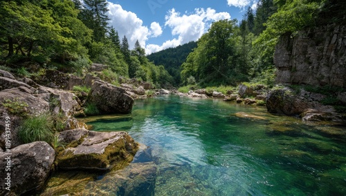 river, water, forest, nature, landscape, outdoors, tree, green, scenic, blue, sunlight, rock, environment, stream, tranquil, beauty, summer, clear, flow, vale, cloud, sky, peaceful, mountain, wild, wood, natural, serene, travel, tour tourism, explore, vibrant, fresh, view, calm, wilderness, stone, gorge, foliage, ecosystem, aquatic, paradise, wanderlust, horizon, photo, journey, destination