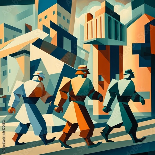 Cubis art with three workers walking surrounded with buildings. Made with Generative AI