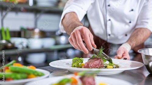chef, culinary, food, eatery, cooking, epicure, dish, plating, presentation, fine dining, kitchen, professional, meal, cookery, vegetable, meat, garnish, preparation, service, skill, artistry, detail, passion, life events, expertise, precision, care, sharpened, craft, gastronomy, delicious, appetising, elegant, refined, colourful, fresh, healthy, background, blur, closeup