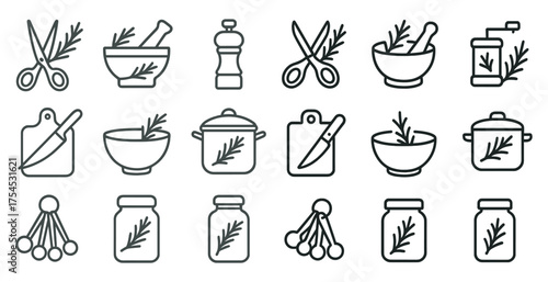 cooking, kitchen utensile, food preparation, line, outline, vector, icon, set, utensil, styling, design, simple, minimalist, herb, pepper, scissors, mortar, jar, chopping board, knife, rosemary, spice, cookware
