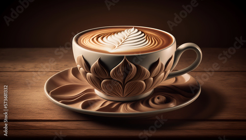 cup full of expresso coffe, wiht latte art, abstract, illustration, in a wooden background, generative ai