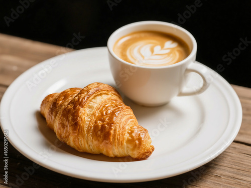 Cup of cappuccino with beautiful latte art served alongside a freshly baked golden croissant on a white plate. Set on rustic wooden table, this cozy breakfast scene represents cafe culture