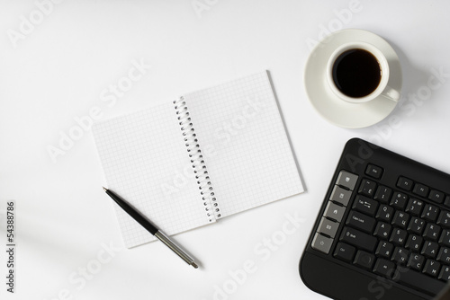 blank, business, hot drink, communication, computer, cup, datum, espresso, hardware, information, cyberspace, keyboard, mouse, note, office, overhead, pen, peripheral, refreshment, technology, white background, wireless, work, workstation, write