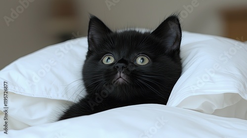 Curious black cat observing surroundings from cozy bed indoor setting high-quality pet photography