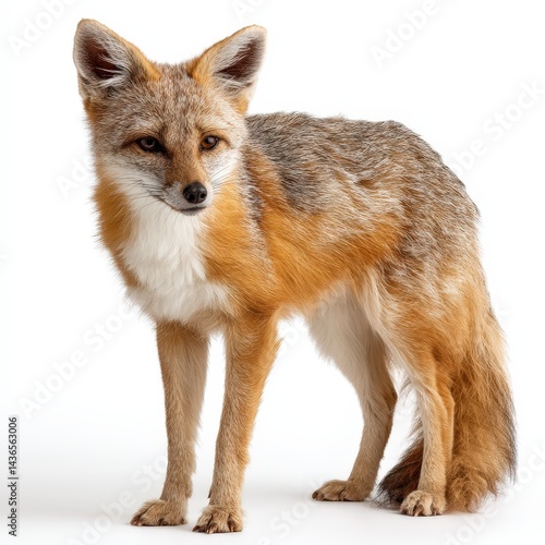 fox, mammal, wildlife, animal, standing, white background, studio shot, isolated, cut-out, portrait, full body, cute, adorable, wild, nature, canino, predator, looking, alert, curious