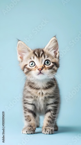 Curious manx cat stands against blue background