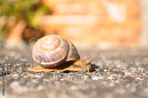 Curious snail crawling on concrete. Burgundy snail, Helix, Roman snail, edible snail or escargot crawling