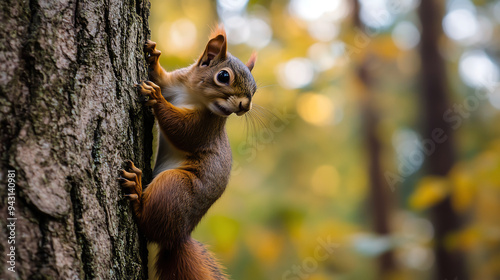 curious squirrel peeking from behind the tree trunk, its tail hanging down and eyes sparkling with excitement in an autumn forest