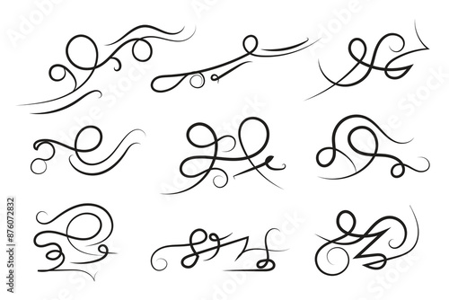 Curly swirl decorative swishes, Hand drawn calligraphy lettering ornate strokes, flourish swirling squiggle Highlight Swoosh typography text elements. Pen Filigree flourishes vintage scrolls
