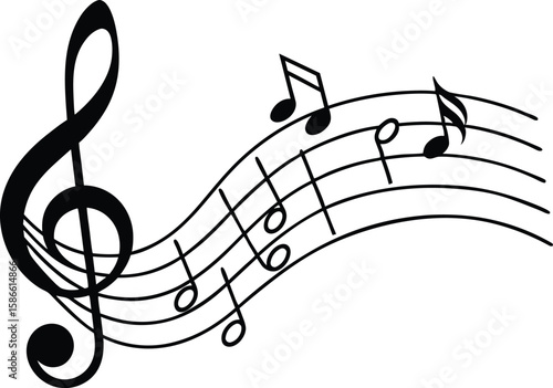 Curved Musical Notes Staff Illustration in Black Silhouette. Treble Clef with Musical Notes Vector Staff Illustration.