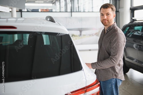 car, auto, vehicle, dealership, showroom, client, buyer, purchase, buying, new, white, man, male, adult, choosing, selecting, opening, trunk, transport, transportation, automobile, sale, retail, consumer, business, finance, investment, loan, credit, ownership, driving, style, luxury, modern, technology, automotive, industry, market, economy, decision, lifestyle, interior, design, comfortable, roomy, elegant, test, drive, happy