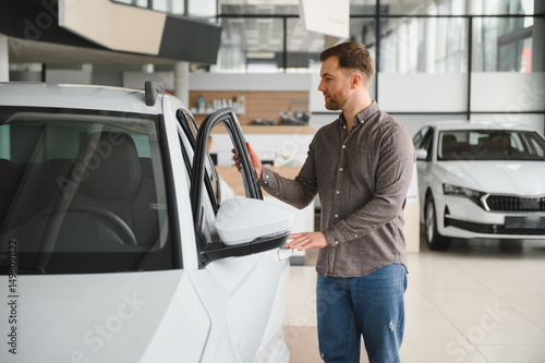 car, dealership, showroom, client, buying, purchase, auto, vehicle, sale, transportation, new, white, man, opening, door, examining, checking, interior, automobile, choosing, selecting, decision, consumer, automotive, retail, business, finance, loan, ownership, driving, test, drive, transport, modern, luxury, style, design, elegant, comfortable, sedan, hatchback, family, lifestyle, investment, insurance, credit, motor, engine, floor
