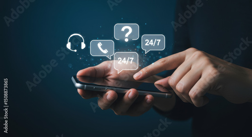 Customer Support 24/7: Hands on mobile phone indicate available help through calls, questions, and online assistance for all issues.