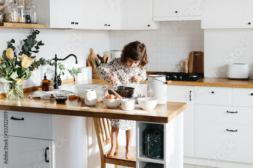 Cute 5 years girl wearing dress preparing cake at the white modern kitchen.