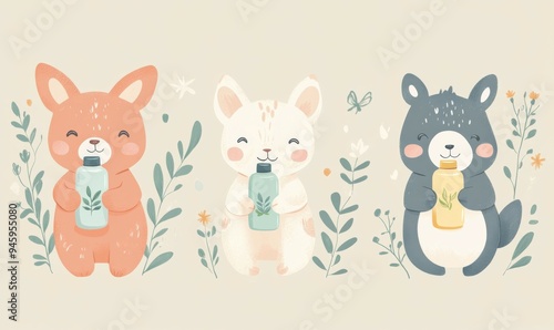 Cute animals holding eco-friendly products in pastel shades while promoting sustainability in a cheerful setting.