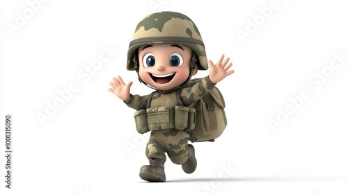Cute army cartoon with a helmet and backpack, waving joyfully, isolated on a bright white background.