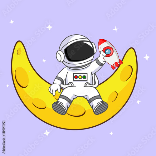 Cute Astronaut Sitting on Crescent Moon Playing Rocket Vector Illustration Cartoon Design
