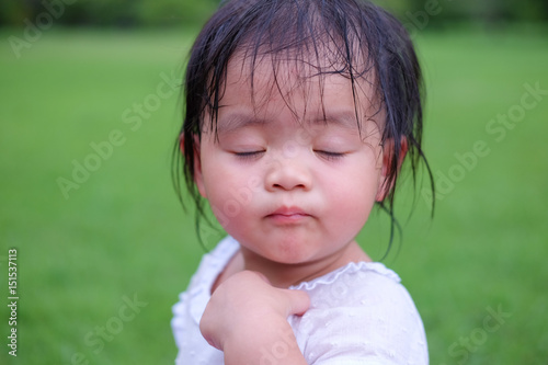 Cute Baby girl playing in the garden, close-up portrait, Portrait of Asian beautiful baby girl of 1 year and 3 months old.
