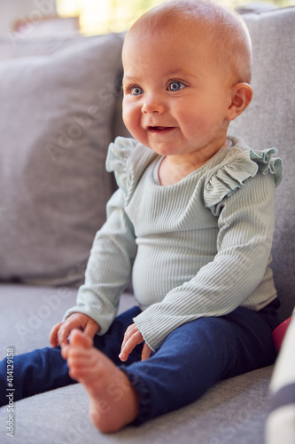 Cute Baby Girl Sitting On Sofa Playing Laughing And Smiling