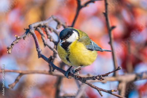 Cute bird Great tit, songbird sitting on a branch without leaves in the autumn or winter.