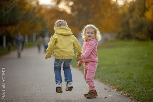 Cute blond toddler children boy and girl,walking in autumn park on sunset, enjoying the beautiful nature