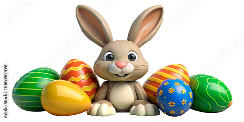 Cute brown Easter bunny with colorful painted eggs, perfect for holiday greeting cards and festive decorations