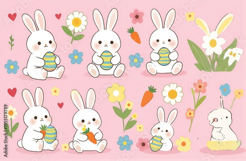 rabbit, egg, carrot, flower, pink, spring, easter, cute, cartoon, children, pastel, smiling, holding, sitting, garden, nature, joy, celebration, holiday, adorable, white, ear, cheek, background, cheerful, soft, colourful, pattern, design, illustration, festive, happy, playful, sweet, fluffy, decorated, painted, illustrated, springtime, aubergine, daisy, blossom