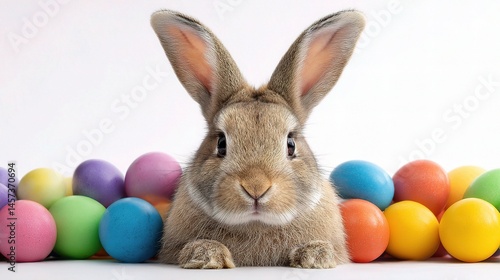 Cute Bunny Surrounded by Colorful Eggs and Smiling Cheerfully