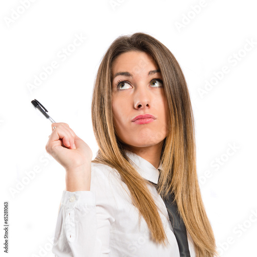 Cute businesswoman thinking an idea over white background