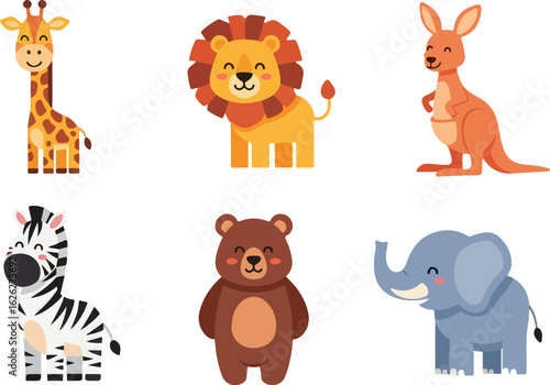 animal, cartoon, giraffe, lion, kangaroo, zebra, bear, elephant, cute, children, illustration, graphic, design, mammal, wildlife, flat, colours, happy, adorable, animal, nature, isolated, children, vector, digital artwork, clip art, character, education, clip art, collection