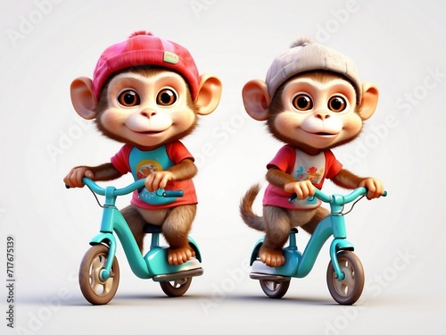 Cute Cartoon Baby Monkeys Wearing Colorful Clothes And Riding Bicycles