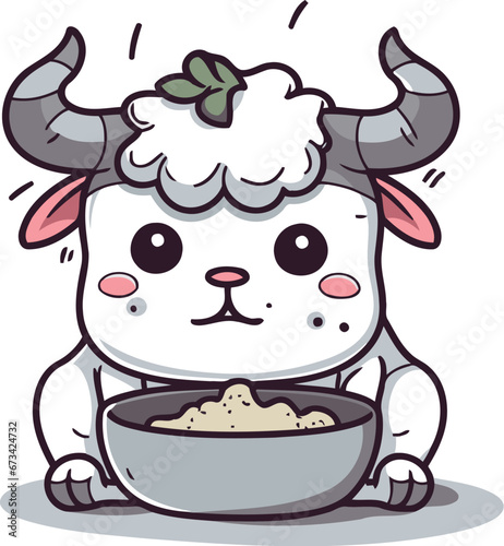 Cute cartoon bull with bowl of cereals. Vector illustration.