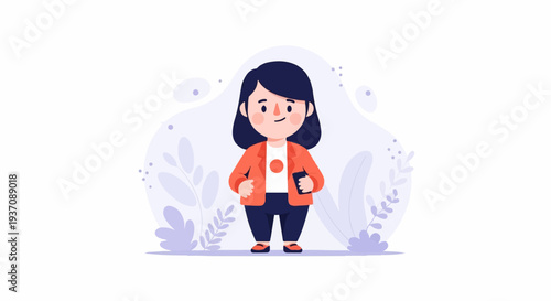 cartoon, character, illustration, girl, woman, female, person, avatar, cute, style, flat, graphic, design, artistic, business, professional, modern, friendly, approachable, confident, stylish, casual attire, outfit, jacket, shirt, pant, shoe, holding, phone, mobile, device, technology, background, leaf, plant, foliage, nature, organic, soft, pastel, colours, purple, white, coral, orange, dark, blue, happy, cheerful