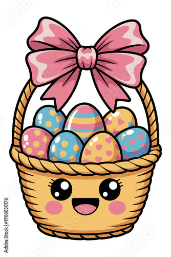 Cute cartoon Easter basket filled with colorful decorated eggs featuring a happy kawaii face and a pink bow perfect for spring holiday celebrations children's invitations and festive greeting cards il