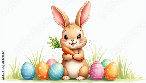 Cute Cartoon Easter Bunny Holding Carrot with Colorful Eggs and Green Grass Illustration