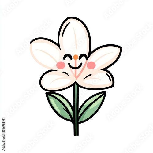flower, cartoon, cute, happy, white, lily, stem, leaf, green, pastel, smiling, face, expression, blossom, adorable, character, drawing, illustration, graphic, simple, line, art, design, vector, animated, digital, bud, soft, light, pink, gentle, nature, spring, summer, floral, pretty