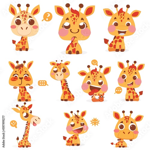 Cute cartoon giraffe emojis, various expressions, white background, digital illustration, perfect for kids' apps