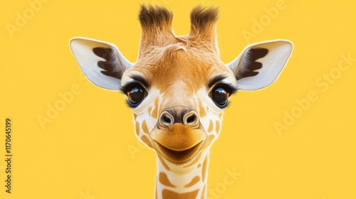 giraffe, cute, animal, cartoon, portrait, yellow, background, happy, wildlife, safari, adorable, mammal, face, head, neck, eye, ear, spot, fur, friendly, nature, wild, zoo, baby, young, fun, joy, expression, sweet, innocent, gentle, charming, delightful, art, illustration, graphic, design, image, photo, digital, vibrant, colourful, bright
