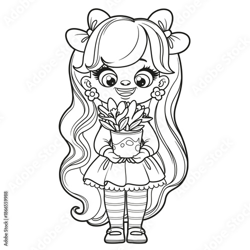 Cute cartoon girl with pot of blooming crocuses outlined on a white background