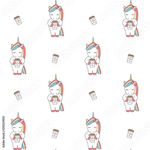 cute cartoon unicorn with coffee seamless vector pattern background illustration