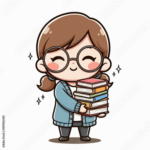 Cute Chibi Girl with Glasses Holding a Stack of Books.