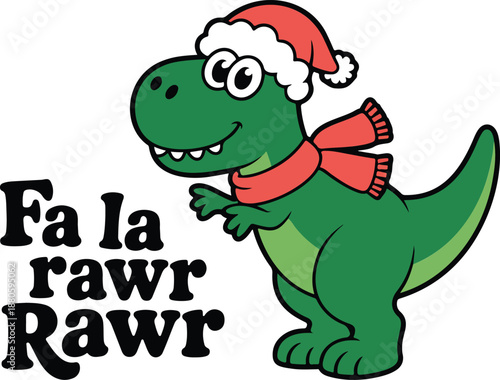 Cute Christmas Dinosaur Vector Illustration Wearing Santa Hat and Red Scarf
