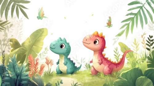 dinosaur, cute, jungle, nature, animal, illustration, children, cartoon, fantasy, forest, plant, leaf, grass, walking, small, adorable, friendly, peaceful, happy, exploration, adventure, wildlife, spring, summer, tropical, green, pink, blue, calm, drawing, digital, art, design, graphic, vignetting, fun, children, love, colours, imagination, beauty