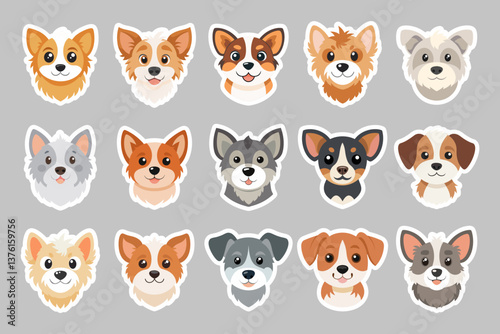 Cute dog face stickers set. Collection of adorable dog faces. Illustration.