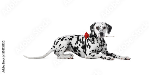 Cute dog holding red rose in mouth on white background. Dalmatian with flower