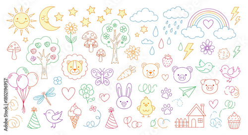 sun, moon, star, flower, tree, cloud, rain, rainbow, mushroom, lion, butterfly, carrot, bear, bird, pig, rabbit, chick, house, balloon, dragonfly, ice cream, party, nubes, lightning, doodle, drawing, outline, vignetting, cute, happy, simple, colourful, pastel, nature, spring, summer, whimsical, playful, sweet, design, graphic, illustration, element, decoration, pattern, childish, fantasy, magic
